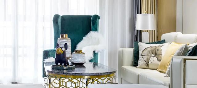 ▲茶几以金属+大理石质感的结合设计,茶几台面上布置上花瓶、杂志与摆饰品,搭配边上的蓝色布艺沙发,整个空间给人的感觉也是轻奢优雅。